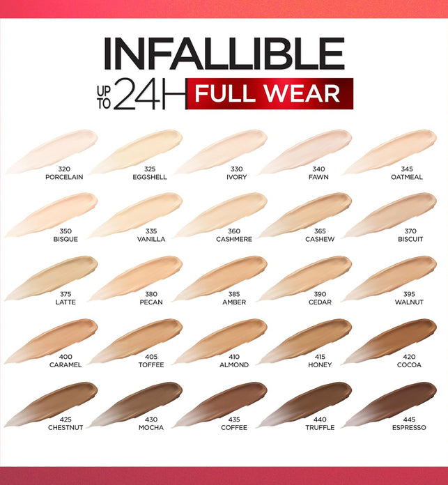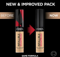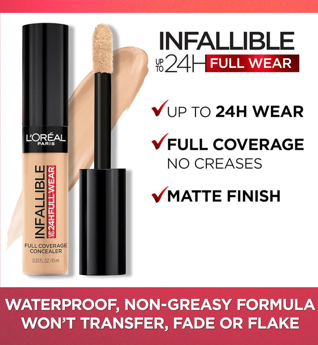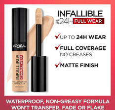Be Unstoppable. Experience full-on coverage and full-face wear for up to 24 hours. New Full Wear Concealer is our highest coverage formula in our widest concealer shade range ever. L'Oreal Paris Full Wear Concealer provides full coverage with a flawless matte finish. This multi-use formula conceals imperfections while doubling as a contour/highlight product. Shape your face by going 1 to 2 shades deeper to contour and 1 to 2 shades lighter to highlightn and brighten. Our extra large applicator provides maximum coverage in 1 stroke to cover under-eye circles, acne scars, and discoloration. Our waterproof, non-greasy formula won't transfer, fade, or flake so your full coverage look is locked in all day. A little goes a long way. Available in 25 full coverage shades for every skin t1.