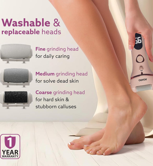 - Interchangeable 3 roller heads include fine grinded head, regular grinded head, coarse grinded head for efficiently removal of hard skin and dry dead skin