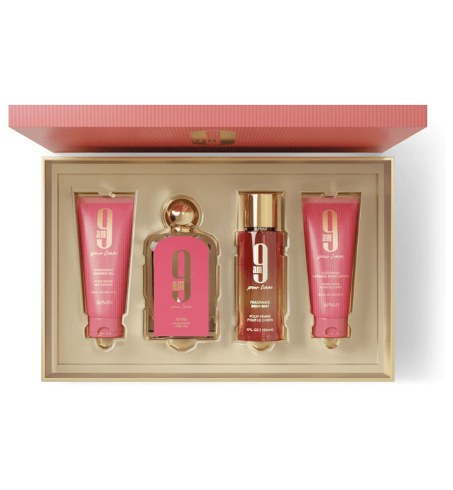 • Elegant Women's Gift Set: Includes 9 AM Femme Eau De Parfum (100 ML), Shower Gel (100 ML), Body Lotion (100 ML), and Body Mist (150 ML).
