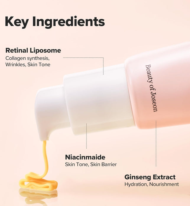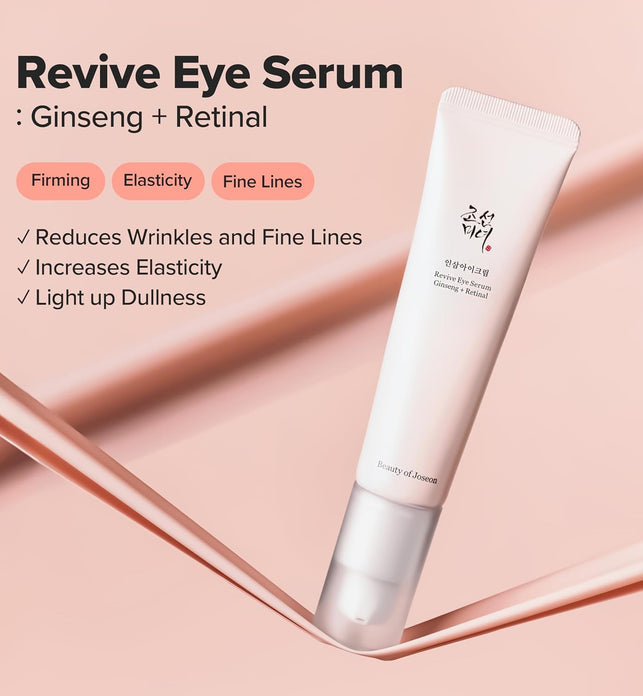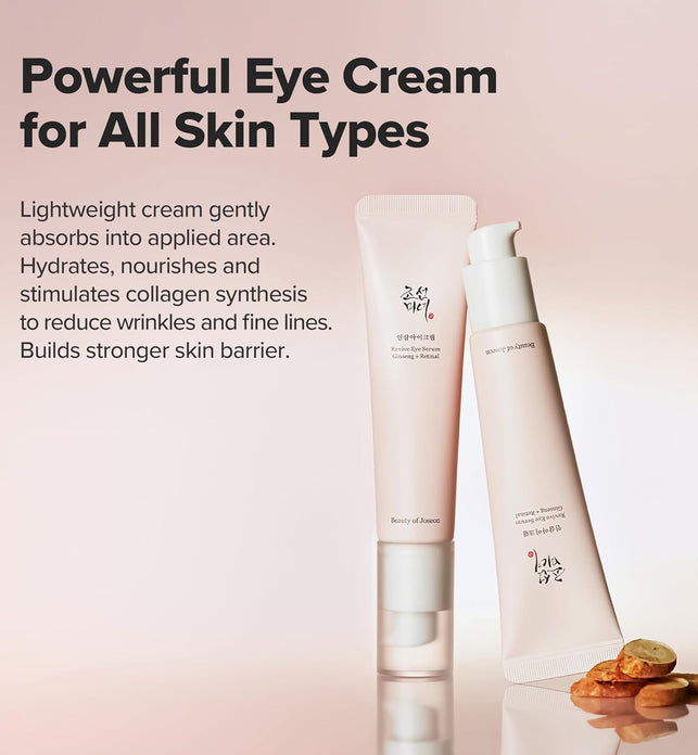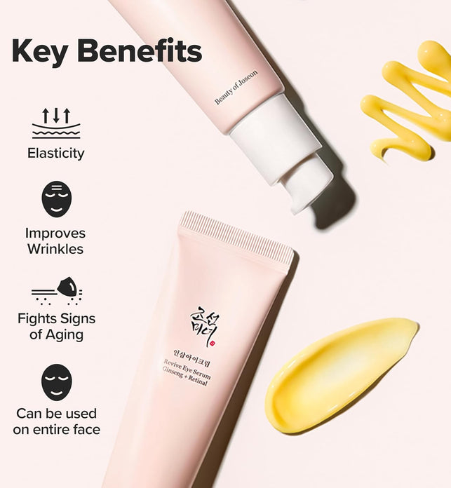 - Ginseng + Retinal: Beauty of Joseon eye serum combines ginseng root extract and liposome-stabilized retinal to support healthy skin and improve visible signs of aging.