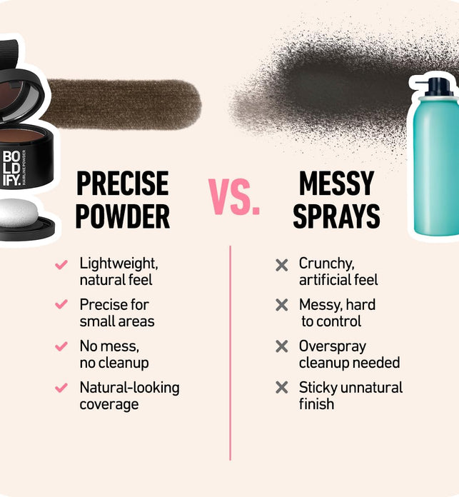 • The Ultimate Hair Root Touch Up, No Sticky, Gunky Feel: While root cover up spray (hair color spray) can be messy to apply and leave your hair feeling greasy, gunked up, and...gross, BOLDIFY Hairline Powder glides on smoothly, providing undetectable highlights and grey hair cover up for Women and Men - without the fake feel. An exceptional Root Touchup Spray Alternative for extending the time between salon visits, and more precise than the average hair fiber for easier hairline coverage.
