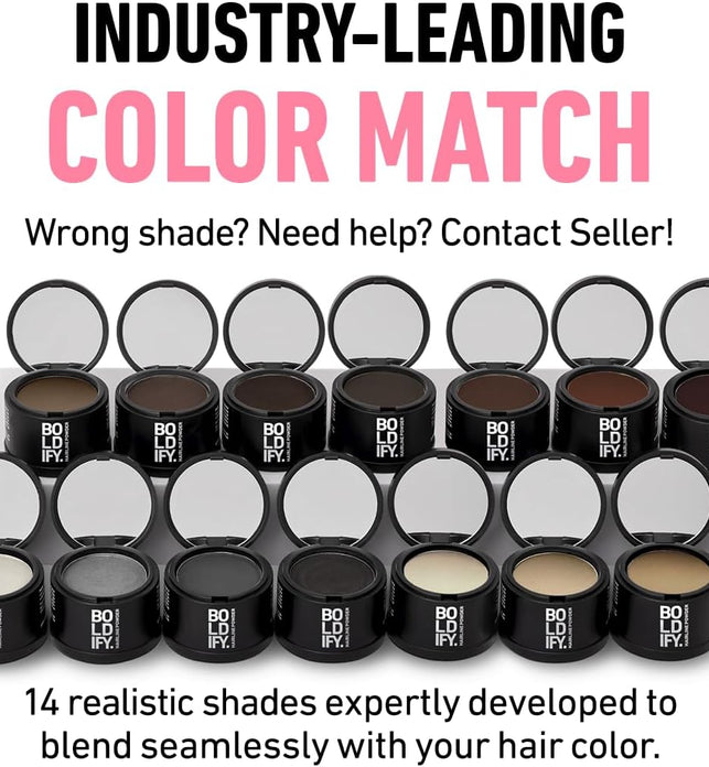 • Instant Coverage, 48-Hour Guarantee - Locks on Until You Shampoo: Hair loss? Skip the embarrassing all-day touch-ups. BOLDIFY is the ultimate hair shadow powder - locking tightly to your follicles and covering your scalp, without clogging pores, for that full-bodied, knock-out look that stays put until your next shampoo. Use by itself or combine with BOLDIFY Hair Fibers for thinning hair for next-level coverage. Works great for grey coverage, rootline touchups, and brightening highlights, too!