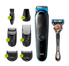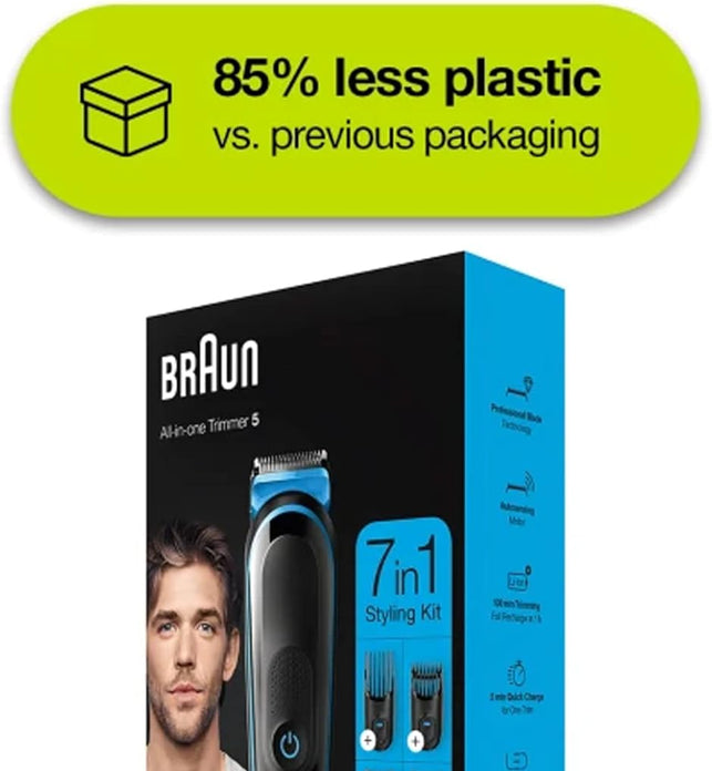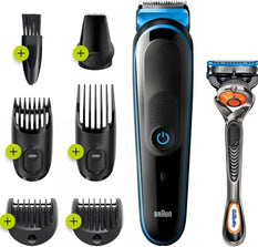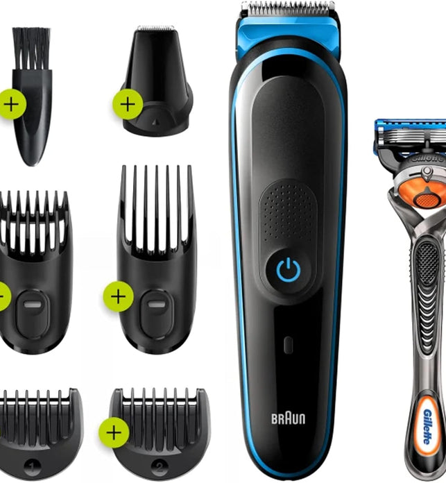 Master your style with the rechargeable MGK5245 7 in 1 beard trimmer for men. Powered by an autosensing motor that tackles both thick and thin beards efficiently, the MGK5245 offers 13 lengths 0.5 21Mm and lifetime sharp metal blades so you can always achieve the look you want effortlessly across your beard and hair. Box includes: 1 x beard & Hair trimmer 1 x detail trimmer 1 x 4 combs 1 x Gillette razor 1 x smart plug charger 1 x Braun All in one trimmer 5 MGK5245 1 x Comb 3 10 mm 1 x Comb 11 21 mm 1 x Fixed combs with 1 mm & 2 mm1 x Detail trimmer1 x Gillette Fusion5 ProGlide razor with FlexBall Technology1 x Cleaning brush 1 x SmartPlug