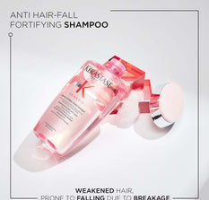 Kerastase Anti hair-fall fortifying shampoo for weakened hair, prone to falling due to breakage. Gently clarifies and reinforces fiber to reduce the risk of hair-fall due to breakage. This ultra-delicate formula is ideal for fine or greasy hair to remove sebum and pollution particles from scalp and fiber. Its gentle cleansing action soothes and hydrates hair from root to tip, leaving a lightweight feel. Enriched with a potent combination of Edelweiss Native Cells and Ginger Root, the formula strengthens the fiber for intense resilience to reduce the risk of hair-fall due to breakage. Hair is prepared to be treated, fortified with a fuller and healthier look.