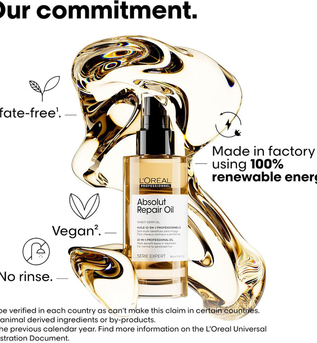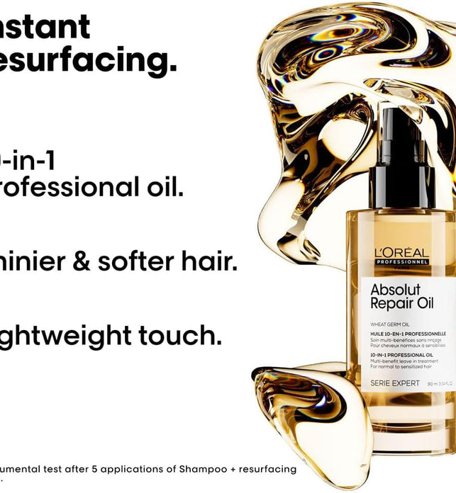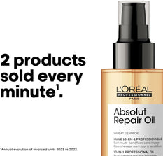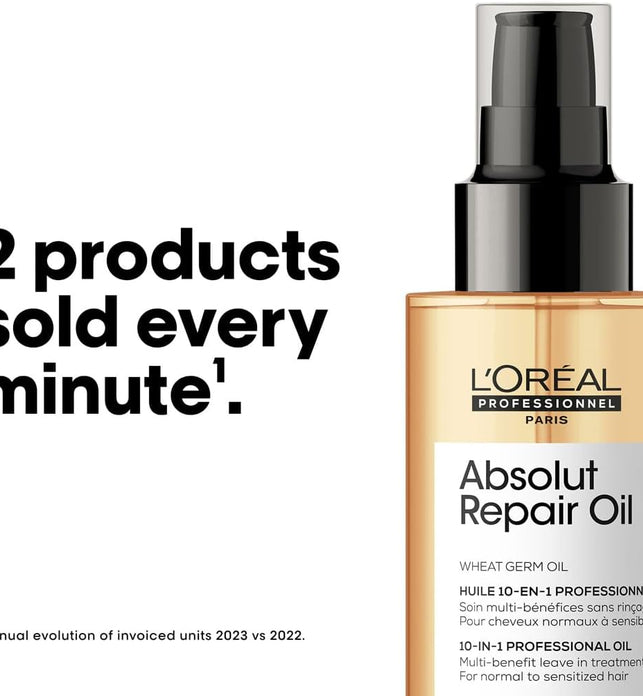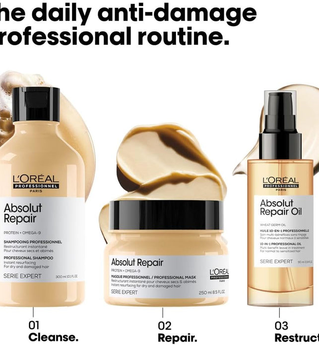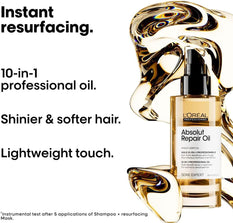 • L’Oréal Professionnel | Absolut Repair Oil multi-benefit leave in treatment | For dry and damaged hair | | Repairs & Hydrates Dry, Damaged Hair | With Protein and Gold Quinoa | SERIE EXPERT | 90ML