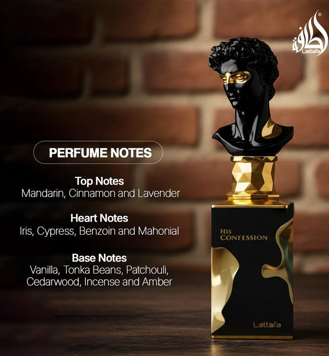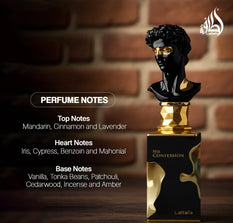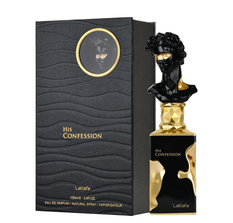 Lattafa His Confession Eau De Parfum Spray for Men is a bold and captivating fragrance that embodies modern masculinity. It opens with a refreshing and spicy blend of mandarin, cinnamon, and lavender, creating an invigorating introduction that immediately commands attention. As the fragrance develops, it reveals a rich heart of iris, cypress, and benzoin, adding depth and sophistication. The composition is grounded by a warm and sensual base of vanilla, tonka beans, patchouli, cedarwood, incense, and amber, leaving a lasting and memorable impression. His Confession combines freshness with warmth, making it versatile for any occasion, whether day or night. This fragrance is the perfect choice for men who seek to exude confidence, elegance, and a touch of mystery, ensuring they make a statement wherever they go.