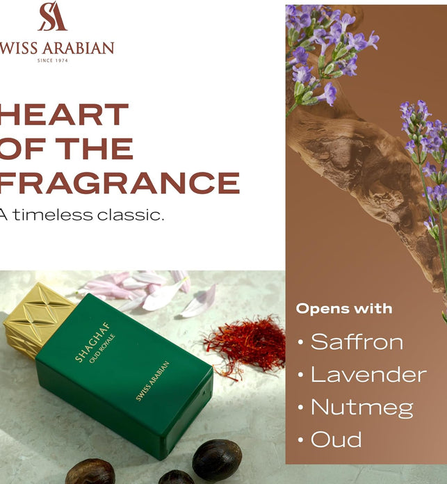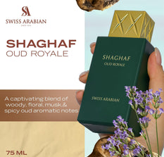 Shaghaf Oud Royale Eau de Parfum by Swiss Arabian is a luxurious unisex fragrance that takes you on an unforgettable olfactory journey. It opens with a rich and enchanting blend of saffron and lavender, creating an immediate sense of opulence and tranquility. At its heart, the fragrance unveils the warm spice of nutmeg paired with the bold depth of oud, delivering a sophisticated and captivating experience that appeals to both women and men. As it settles, sensual musk and earthy patchouli form a lingering base that adds warmth, mystery, and elegance. This multi-layered eau de parfum blends spicy, woody, and aromatic notes to create a refined and timeless perfume. Whether worn for a special evening or as an everyday signature scent, Shaghaf Oud Royale elevates your presence with every spritz. Crafted for fragrance lovers who seek distinction and sophistication, it is the perfect perfume to complement a confident and elegant personality. Designed as a women and men’s fragrance, it brings together exotic richness and enduring charm in one unforgettable bottle. Shaghaf Oud Royale is not just a perfume, it is an experience that defines boldness and refinement with every note.