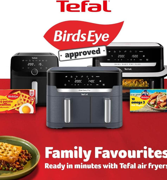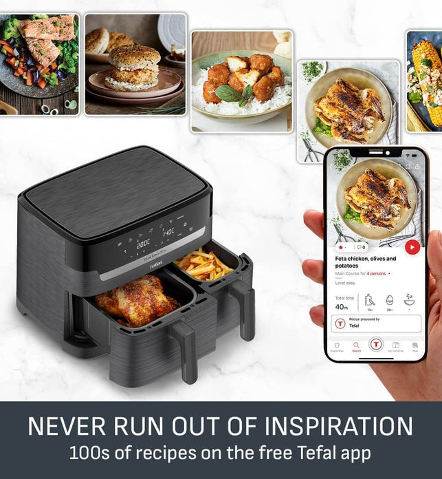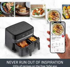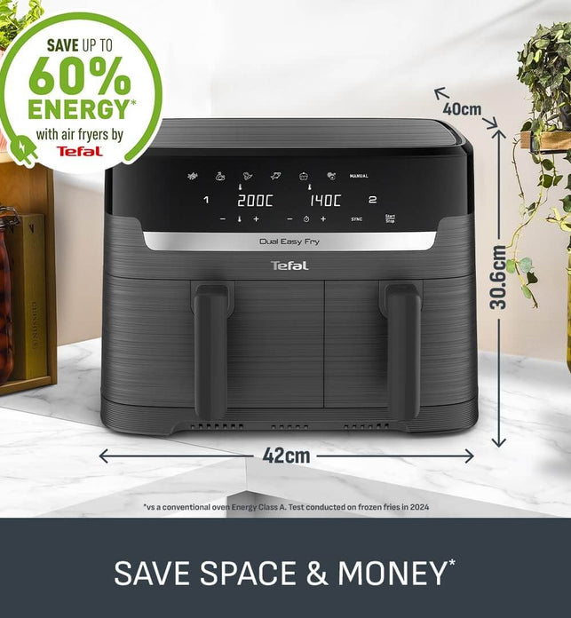 - COOK FASTER AND SAVE ENERGY: Get that crispy crunch and taste you love in less time. With the Easy Fry Dual air fryer you can prepare a wide variety of meals 40% faster than in a conventional oven, whilst saving up to 70% energy. External test cooking 1000g of frozen French fries, compared to a Tefal convection oven.|Up to 70% energy saving with air fryers by Tefal vs conventional oven Energy Class A.Tests conducted in 2022 on frozen fries.