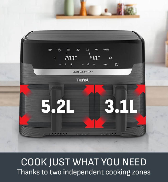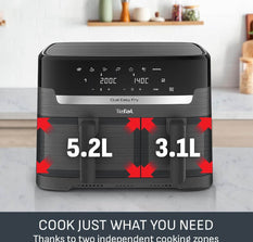 - 2 AIR FRYERS IN 1: With two different sized drawers (5.2L/3.1L), Easy Fry Dual Coal with an airfryer plategives you a single and dual air fryer in one compact footprint. Heat the small drawer on its own (and save energy) or use both to cook two foods, two ways, at once!