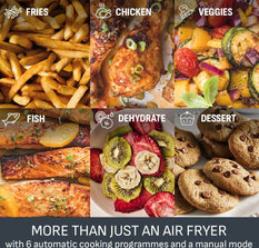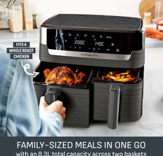 - MORE THAN AN AIR FRYER: Not just for chips, this double air fryer roasts succulent chicken and veg, sears seafood and steaks, and even bakes cakes. Fancy dehydrating fruit for snacks? It does that, too. 8 programs eliminate guesswork, so get creative!
