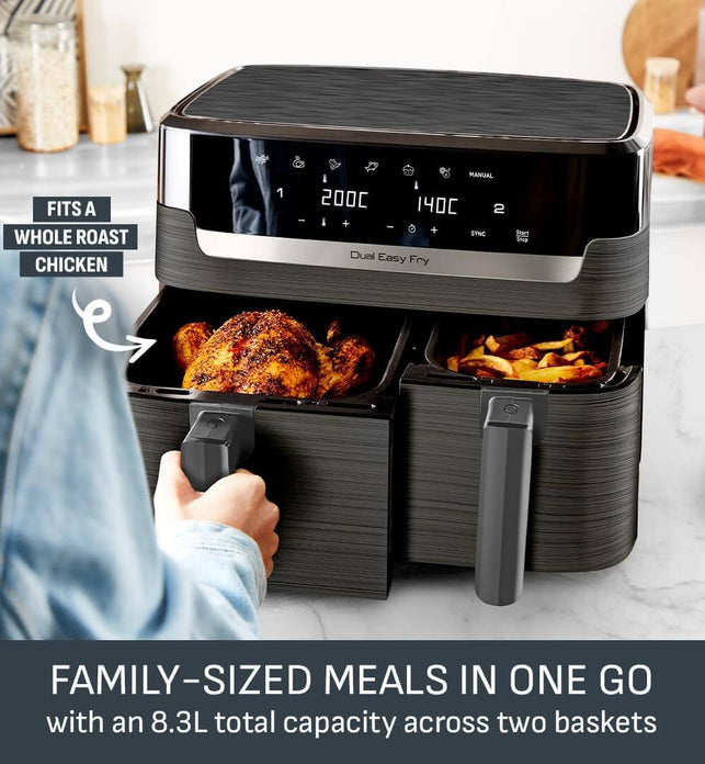 - SINGLES OR DOUBLES: The small drawer is perfect for single portions. Extra guests? Double up with the XL drawer – the combined 8.3L capacity feeds up to 8! Or cook a main and a side and SYNC the finish to ensure everything is ready at the same time.